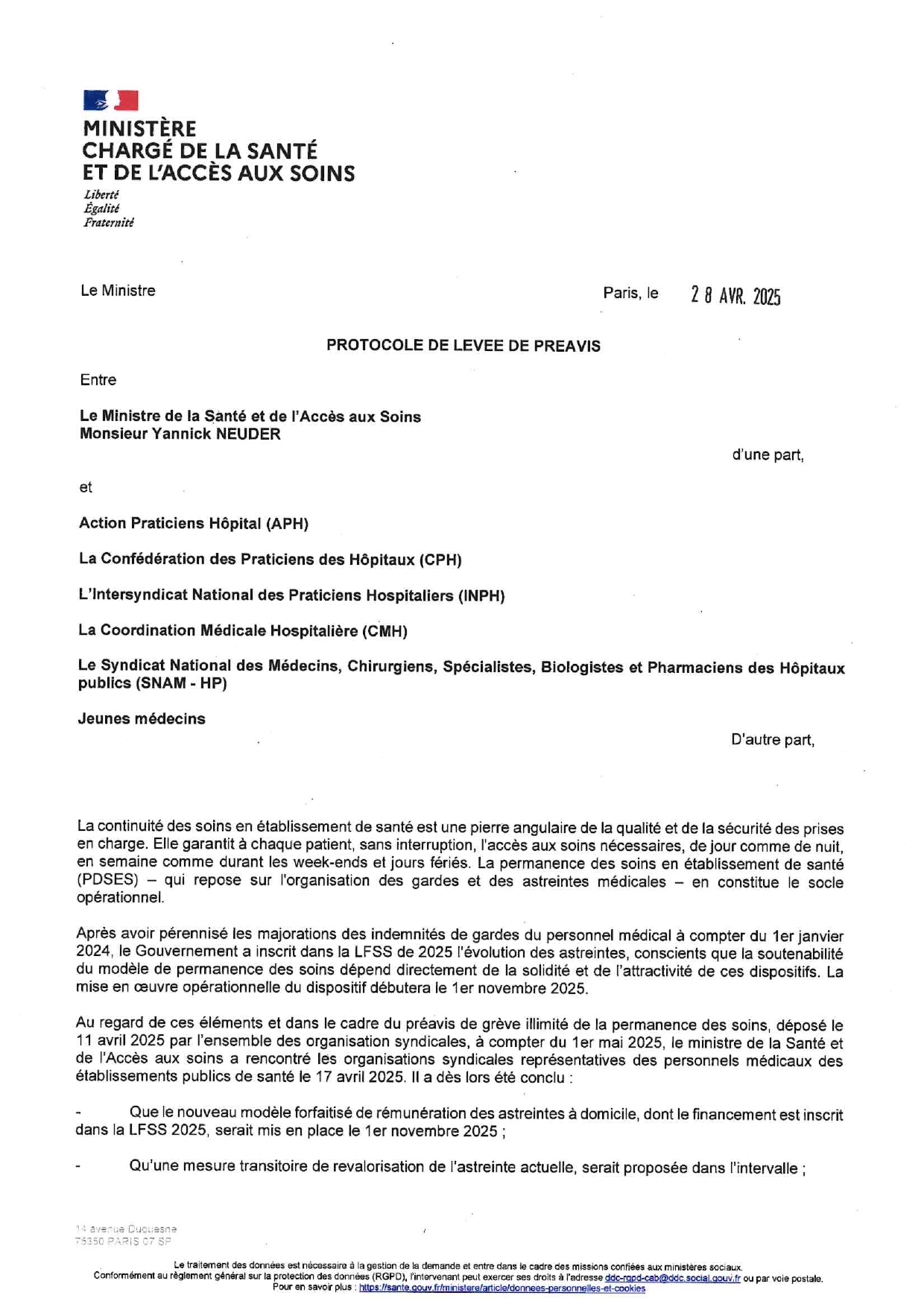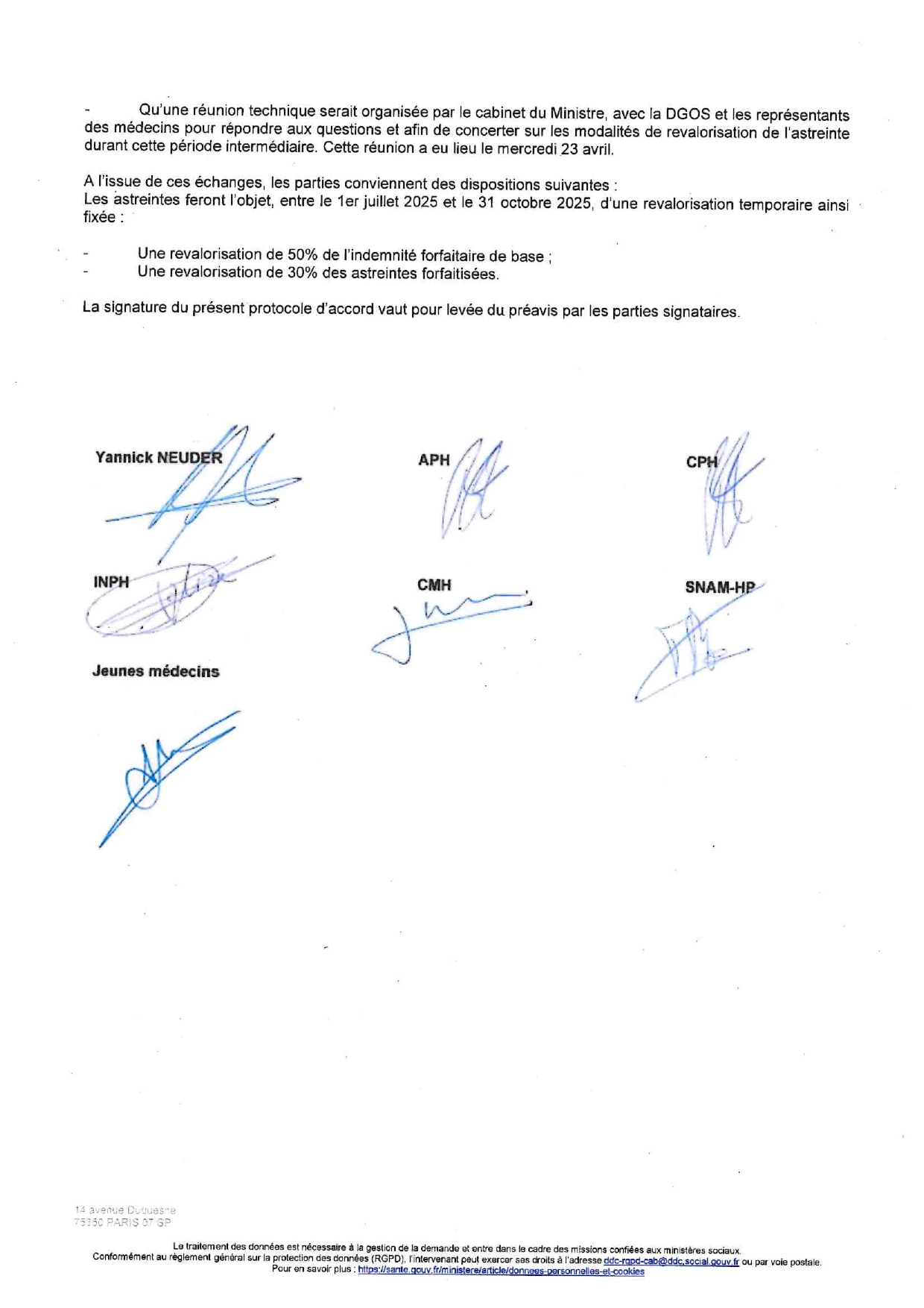 Les syndicats hospitaliers APH, CPH, INPH, CMH, SNAM-HP, JEUNES MEDECINS ont signé avec le Ministre de la Santé et de l'accès aux soins :Une revalorisation de 50% de l’indemnité forfaitaire de base