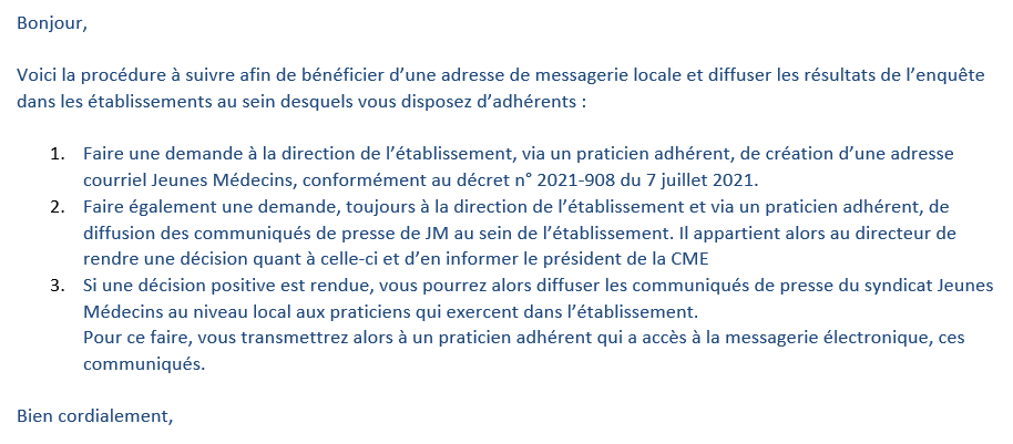 Action Praticiens Hôpital & Jeunes Médecins considèrent cette procédure comme une véritable entrave à la libre circulation de l’information syndicale et dénoncent l’approbation préalable des directeurs pour permettre aux organisations syndicales de diffuser librement les messages auprès des personnels médicaux.