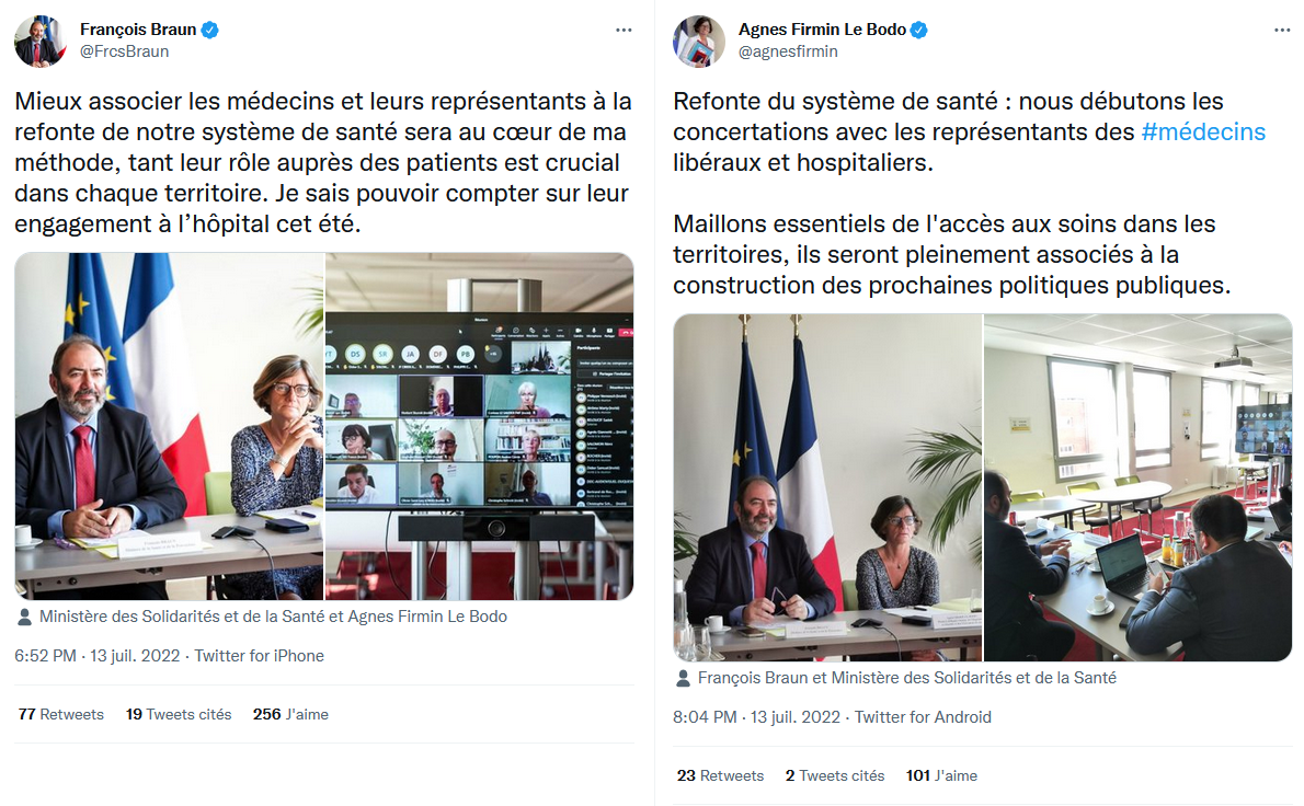 Dans un contexte de crise du système de santé sans précédent, Monsieur le ministre de la Santé, François Braun, accompagné de Madame la ministre déléguée, Agnès Firmin le Bodo, a convié, ce mercredi 13 juillet, un regroupement de représentations médicales constitué de l’ensemble des syndicats de médecins libéraux, hospitaliers et étudiants pour lancer une première phase de concertation comme en attestent leurs tweets :
